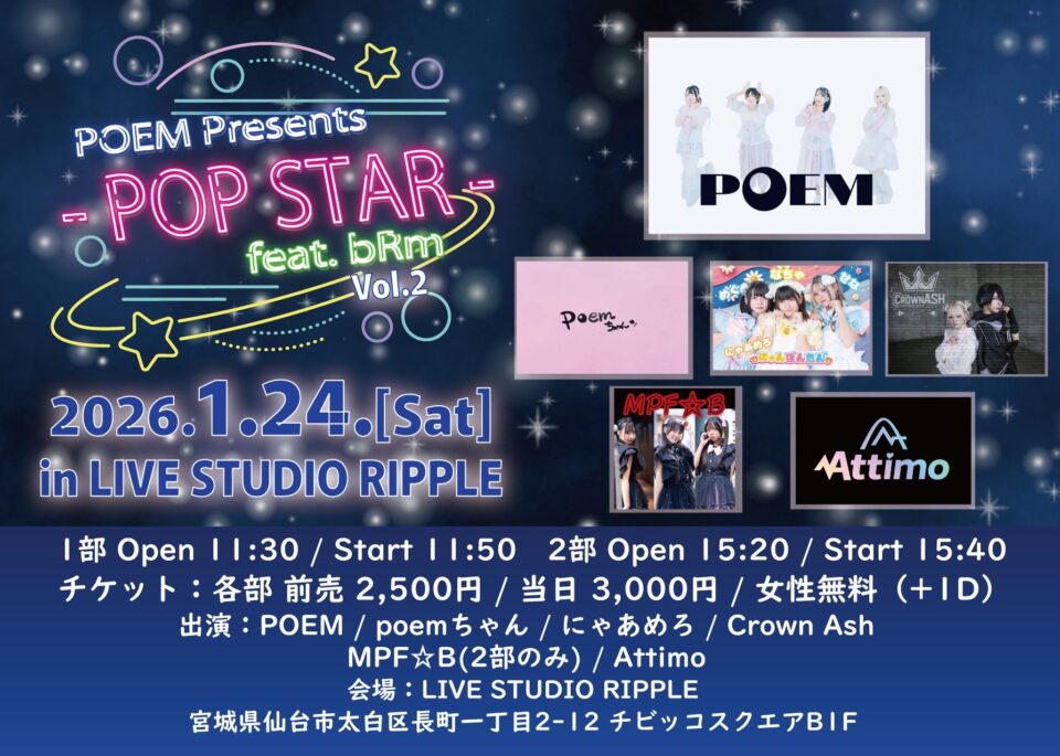 | 出演予定 | POEM / poemちゃん / にゃあめろ / Crown Ash / MPF☆B(2部のみ) / Attimo |