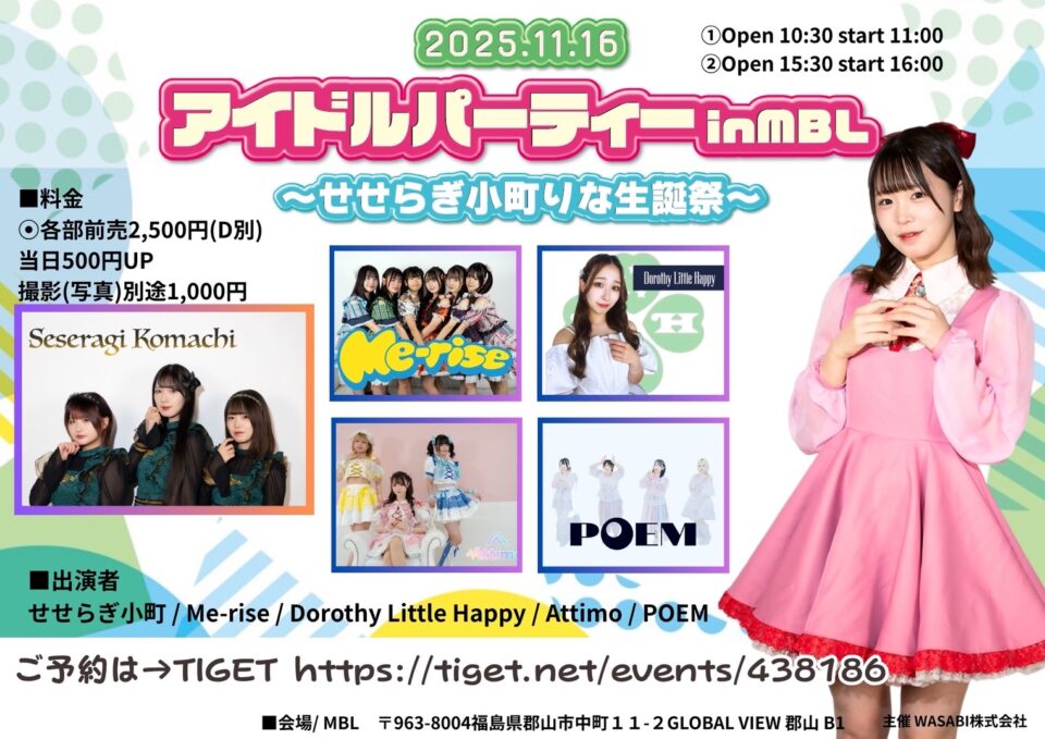Uncategorized2025/11/16[sun]アイドルパーティー in MBL 2025 11 16〜せせらぎ小町りな生誕祭〜 @郡山 Posted on 2025年10月21日 by POEM 21 10月 続きを読む →