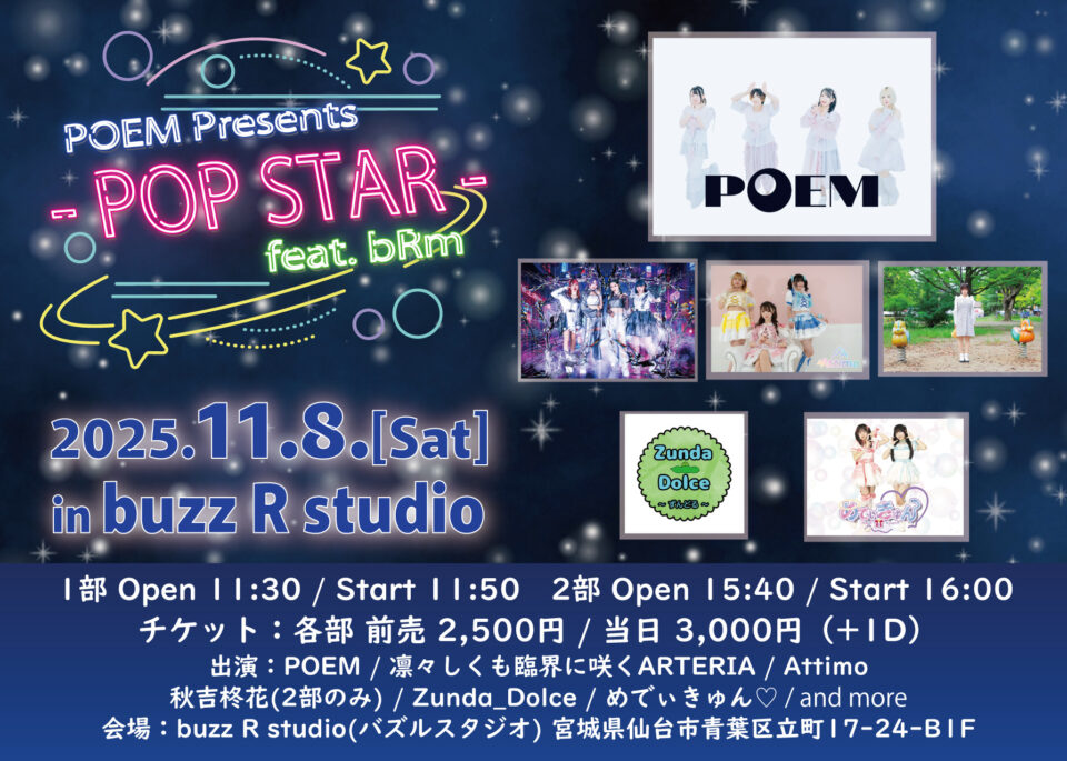 Uncategorized2025/11/8[sat]POEM presents 「POP STAR」feat.bRm @仙台 Posted on 2025年10月26日2025年10月26日 by POEM 26 10月 続きを読む →