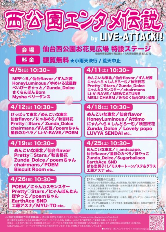 Uncategorized2026/4/19[sun]【西公園エンタメ伝説 by LIVE-ATTACK!! ~桜咲く西公園から“春の賑わい”をステージ発信!~ @仙台 Posted on 2026年3月31日 by POEM 31 3月 続きを読む →